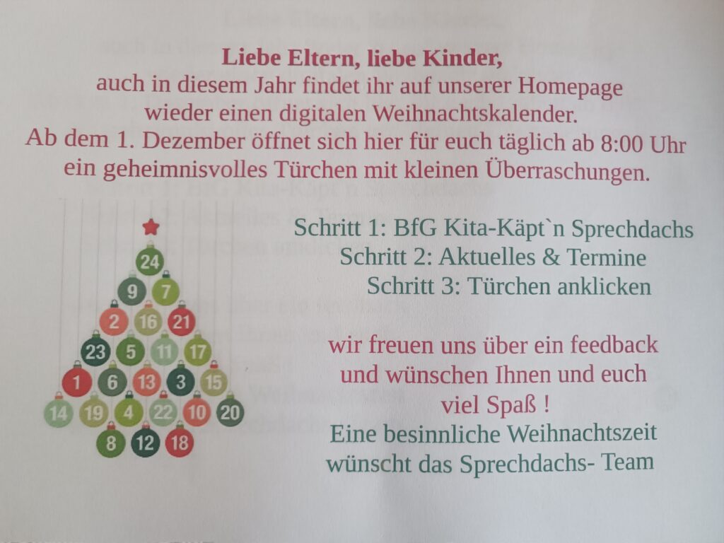 „Bald bald bald… Bald ist das warten vorbei…“, so singt Rolf Zuckowski in einem bekannten Weihnachtslied (Bald, bald, Bald). Auch bei Euch ist BALD das Warten vorbei und Ihr könnt das erste Türchen am Adventskalender öffnen. Um Euch, liebe Kinder der KITA „Käpt´n Sprechdachs“ und auch allen anderen Kindern, das Warten auf den Heiligen Abend […]